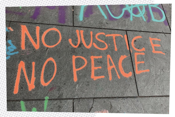 A common chant that can be heard at protests and rallies is, No Justice, No Peace. This phrase generally conveys the idea that if people don’t get the justice they deserve the the system of oppression that is being confronted will not be allowed to continue without disruption, without resistance.
