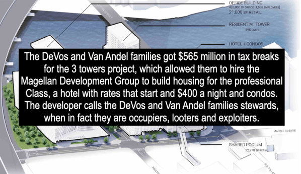 Doug DeVos can try to control the narrative around recent history, but we all know that he and his family are the primary beneficiaries of the Grand Action 2.0 projects. Just within the past few years, the DeVos family has been the primary driving force behind the Amphitheater, the Soccer Stadium and even convinced City officials to provide $565 million is subsidies for their Three Towers project, which will provide housing to people who are well off. Below is a list of GRIID articles on the Three Towers project.