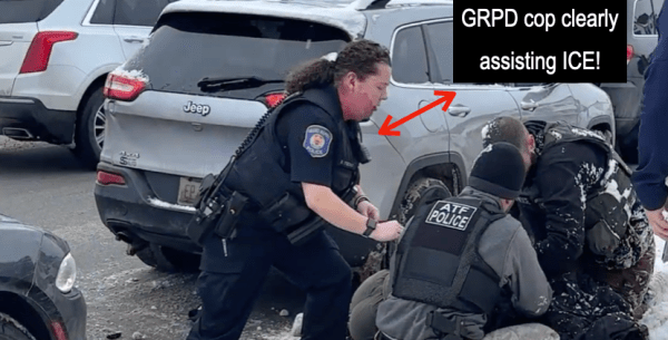 Allowing the GRPD the last word, without any verification of their claims favors the police position on this matter. However, as the GR Rapid Response to ICE person stated during the Press Conference, “the video shows clearly that the GRPD showed up just seconds after the ICE agent is forcing Byron into the snowbank, with the GRPD standing a few feet away. The GRPD can justify their actions however they want, but it is clear that the GRPD was contacted by ICE to assist in the arrest and to make sure that members of GR Rapid Response to ICE would not interfere with without putting themselves at risk.”