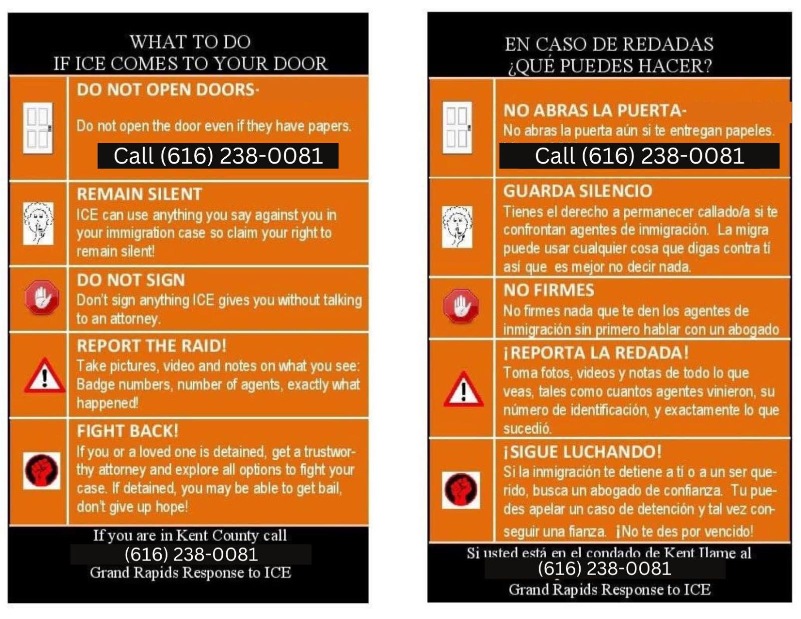 They have a hotline for people being targeted by ICE, with tips on what to do if ICE comes to their home, their workplace, their children’s school or anywhere else in the community. People can call that number to give GR Rapid Response to ICE information about where ICE is, then deploy people who have been trained to directly intervene with the goal of preventing ICE from taking people.