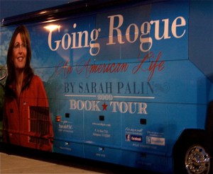 If Palin wanted to travel inconspicuously, her tour bus definitely was not the way to go. As the bus pulled up to the gathering, plastered onto either side of the vehicle was a massive portrait of Sarah the folksy outdoors woman, amidst the mountains of Alaska and the words “Going Rogue: An American Life”. Palin has never been about doing things quietly.