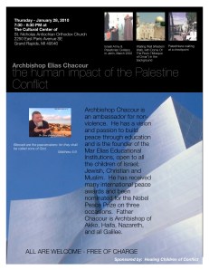 Chacour will speak at the Cultural Center of St. Nicholas Antiochian Orthodox Church located at 2250 East Paris SE in Grand Rapids. The presentation begins at 7:30 pm and is sponsored by Healing Children of Conflict.