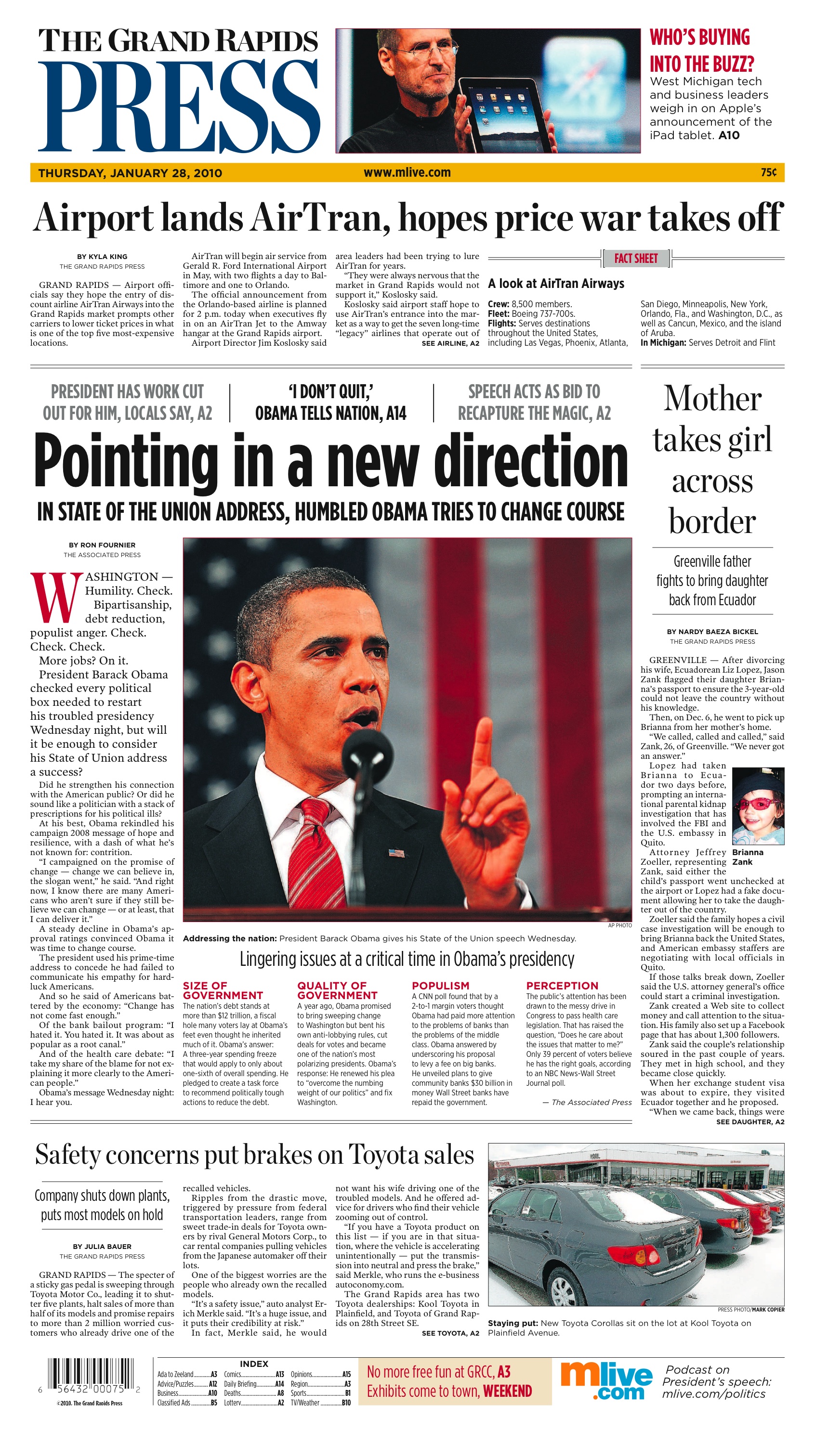 As could be expected the was coverage in today’s Grand Rapids Press responding to the President’s State of the Union address last night. On page 2 the Press ran a story by reporter Ted Roelofs, which featured local reactions to the Obama’s speech.