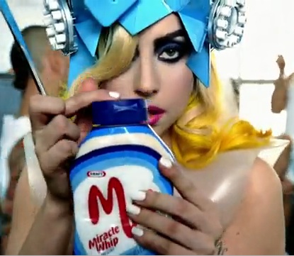 Gaga prominently displays at least ten different brands in the video, including Virgin Mobile (sponsor of her Monster Tour), Miracle Whip, Wonder Bread, Polaroid and Diet Coke. Of the many products shown, only a few brands paid to be included, according to Gaga’s manager, Troy Carter. Wonder Bread’s appearance was unpaid, but Miracle Whip paid to be featured, even though in the video Gaga combines the two products to poison a diner full of patrons. Polaroid cameras appeared after Gaga signed a new deal to become creative director for the Polaroid company. She is charged with reinvigorating the brand, which was killed off by the digital camera revolution (but is attempting a comeback).