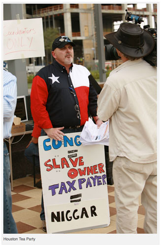 Hannity’s tea party leader was reportedly kicked out of tea party event for carrying sign with racial slur. The Washington Independent’s David Weigel reported on January 4 that “Dale Robertson, a Tea Party activist who operates TeaParty.org, is getting stung for an old photo — taken at the Feb. 27, 2009 Tea Party in Houston — in which he holds a sign reading ‘Congress = Slaveowner, Taxpayer = Niggar.’ ” Weigel also reported that “Josh Parker of the Houston Tea Party Society tells me that Robertson was booted out of the event for this sign.” Weigel included this picture: