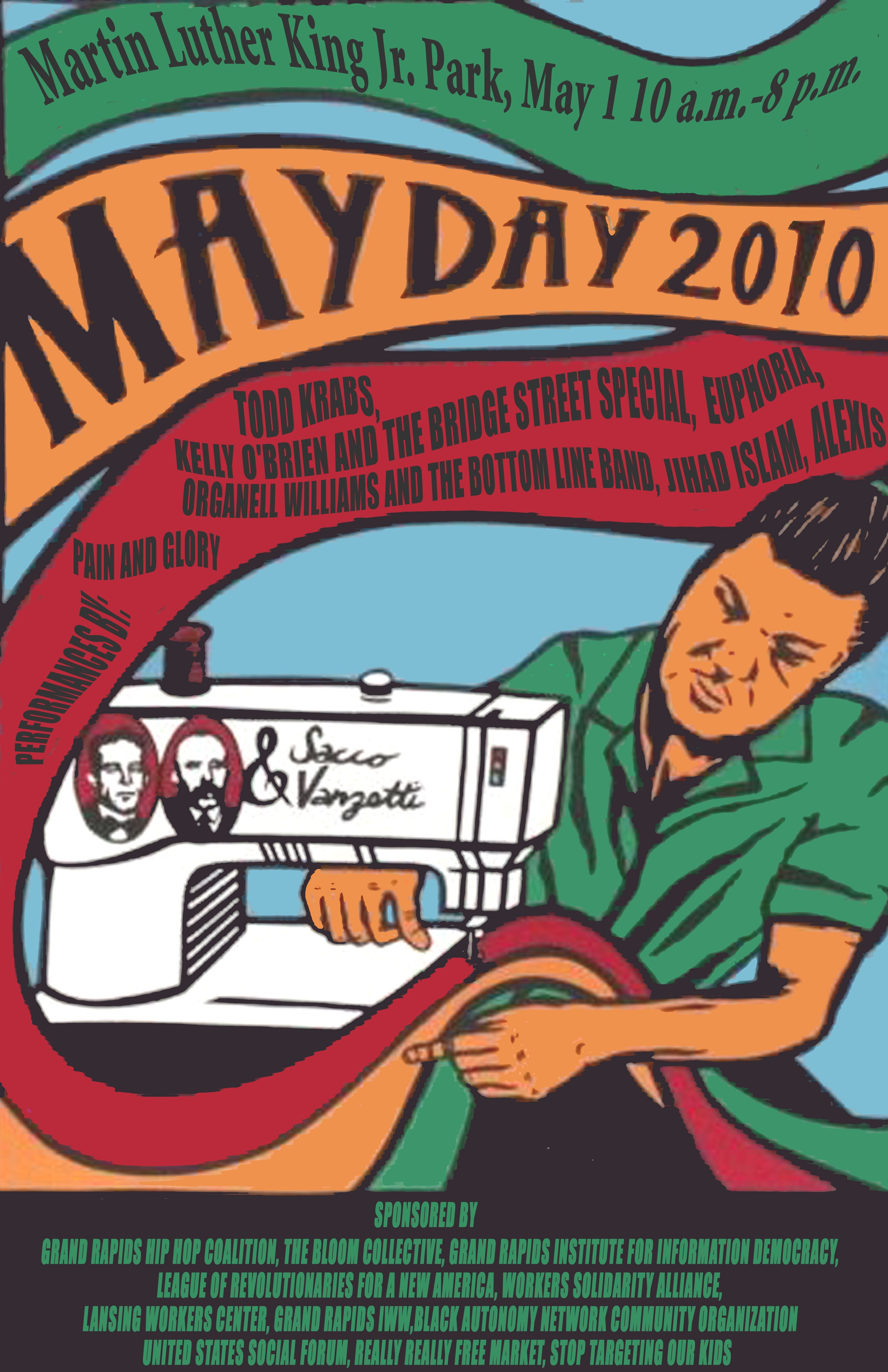 Co-sponsors of MayDay 2010 include Grand Rapids Hip Hop Coalition, The Bloom Collective, League of Revolutionaries for a New America, STOK, Workers Solidarity Alliance, Grand Rapids Institute for Information Democracy (GRIID), Lansing Workers Center, Black Autonomy Network Community Organization (BANCO), United States Social Forum (USSF), and the Grand Rapids IWW.