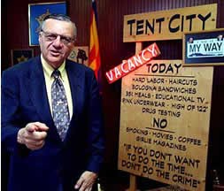 Using the terms “Tent City” and “a strong proponent of the new Arizona immigration law” hardly reflect the realities of the tactics and policies that Sheriff Arpaio uses to enforce his brand of the law. The Phoenix New Times refers to the lawman’s policies as a “Reign of Terror” and the San Diego Immigrant Rights Consortium has a long list of documented human rights violations and abuses under Sheriff Arpaio.