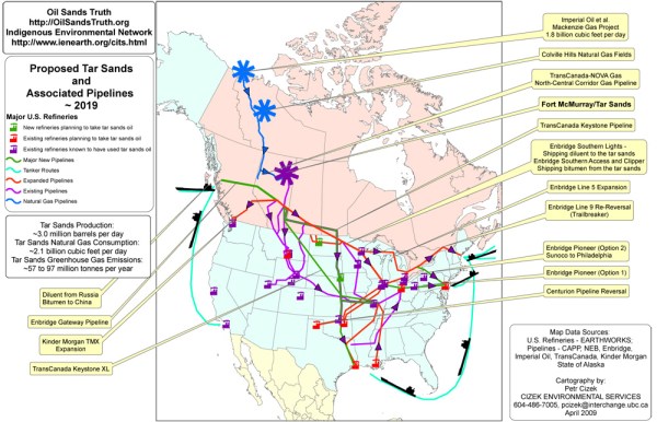 The role that Enbridge will play is to construct pipelines that will carry the asphalt-like substance to the west coast, where it will be transported to Asian refineries. Most of pipelines will go through indigenous territories throughout Canada, according to Andrew Nikiforuk, author of one of the best books on this topic, Tar Sands: Dirty Oil and the Future of the Continent.