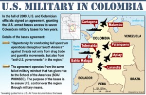 The Tolemaida military base is one of seven Colombian bases to which the U.S. military has been granted access for 10 years under the U.S.-Colombia Defense Cooperation Agreement, which was signed in October 2009. The agreement has been met with opposition by Colombian and international human rights groups. It caused tensions in the region after a U.S. Air Force document became public that revealed that the United States military is planning to use the seven Colombian bases for “full spectrum operations throughout South America” against threats not only from drug trade and guerrilla movements, but also from “anti-U.S. governments” in the region.