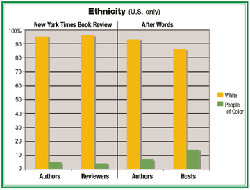 After Words was only slightly more ethnically diverse. Whites accounted for 93 percent of the U.S. authors; among the non-white authors, all but one were black. The study found nine international authors on After Words, coming from a range of countries, including Uruguay, Kenya and India.