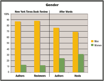 The numbers on gender were likewise unbalanced, with men the dominant presence in both outlets. In the Times Book Review, women made up just 13 percent of the authors of political books and 12 percent of the reviewers. After Words fared somewhat better, with women constituting 24 percent of the authors and 31 percent of the interviewers.