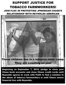 Beginning Monday, September 13, FLOC supporters will be organizing actions nationwide in front of Chase branches to increase awareness about the abuses in the fields of NC and to keep building on the Chase divestment campaign. We will continue to organize events at Chase Bank branches throughout the campaign until Chase agrees to help find a solution or it severs financial ties with Reynolds American. Click here for more info and to download the Chase Organizing Toolkit.