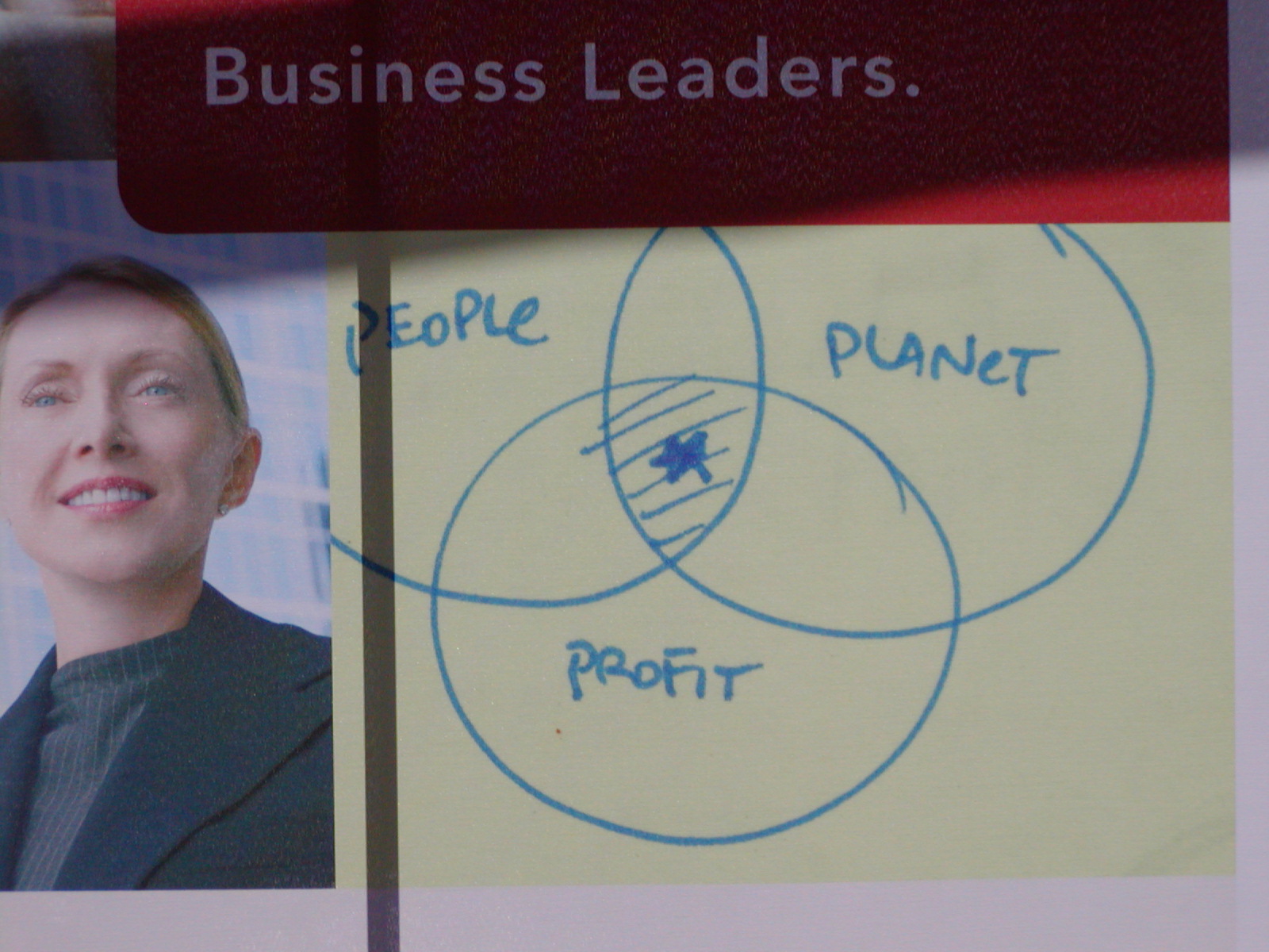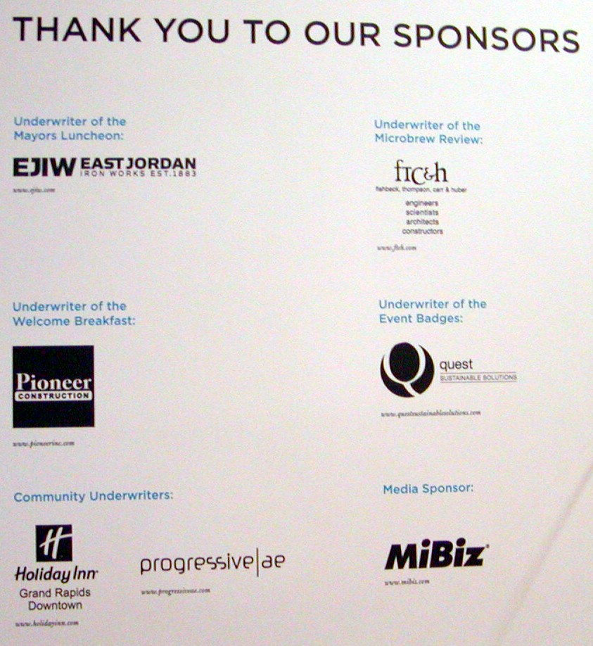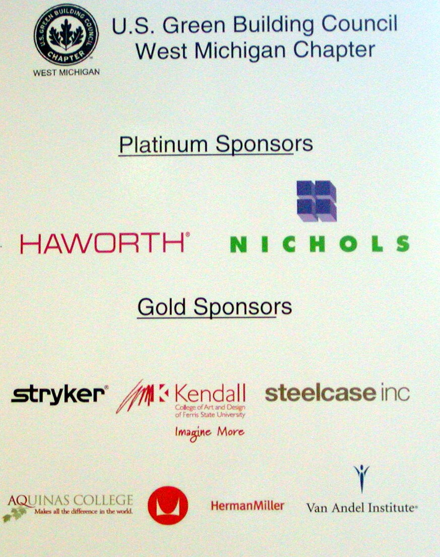 outside the conference rooms where the event’s sponsors were highly visible: GVSU and Aquinas College (both offering majors in sustainable business), Pioneer Construction, Rockford Construction, East Jordan Iron Works, Consumer’s Energy, Pizzo Ecological Restoration and MiBiz. Other underwriters included the Kellogg Foundation, Holiday Inn and the architectural and engineering firm, Fishbeck Thompson Carr and Huber. Oddly, no local, state or national environmental organizations were among those represented.