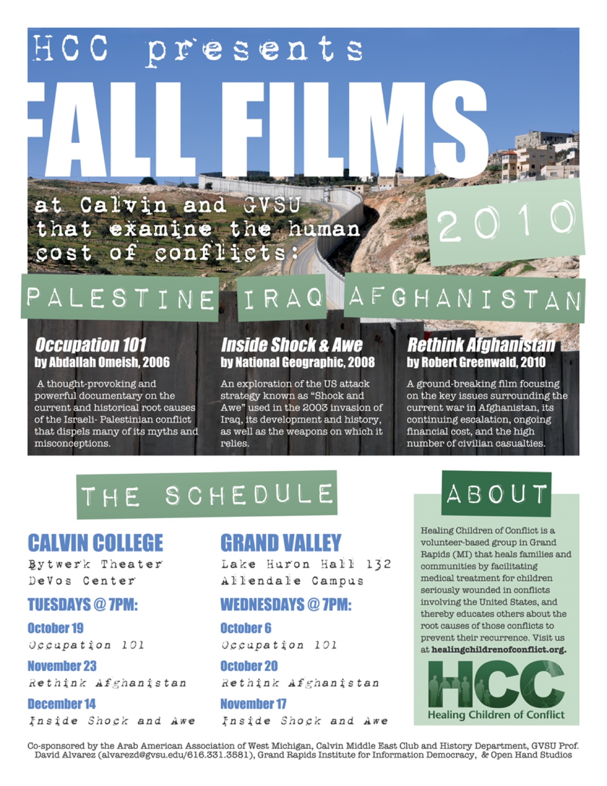 The Grand Rapids-based group Healing Children of Conflict (HCC) will be hosting a film series beginning in October to raise awareness about the human cost of US policies in Iraq, Afghanistan and Palestine.