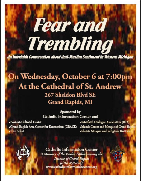 Wednesday night, about 160 folks from Christian, Jewish and Muslim faith communities met for dialogue at St. Andrew’s Cathedral via the Catholic Information Center’s program, Fear and Trembling: An Interfaith Conversation about Anti-Muslim Sentiment in Western Michigan.