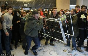Recent events in Greece and France where students played a large part in the unrest over public sector cuts appeared to have inspired today’s actions. Chants of “Greece, France, now here too!” echoed through the HQ as people stormed up the stairs.