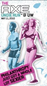 Second, this kind of stuff has been spreading around campuses for awhile sadly. It was Axe who sponsored this “undie run” last year (this ad is actually from last year) but apparently other corporations have in the past. Even here in the Grand Rapids area there has been a “Nearly Naked Mile” organized by the Invisible Children group as a “benefit” for Africa. This kind of “activism” and ‘philanthropy” makes me sick!