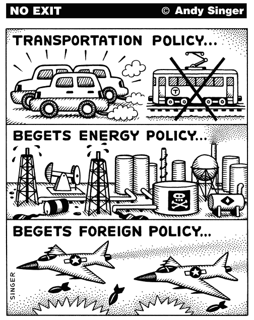 The dependency that most area residents have on cars results in an ongoing battle for more parking space, which contributes to ecological destruction and climate change. It also contributes to air and water pollution and a host of other social costs, such as insurance costs, injuries and deaths from traffic accidents. If we are serious about meeting the goal of 80% carbon reduction then incremental mass transit improvements will not be adequate.