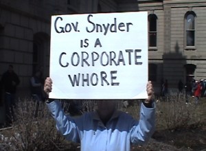 People carried signs that reflected their anger, some of which was targeted specifically at Governor Snyder and some of it because of the threats to local municipal autonomy, which was threatened with the new legislation that will allow the state to appoint “emergency managers” to communities that are facing a serious financial crisis.