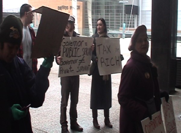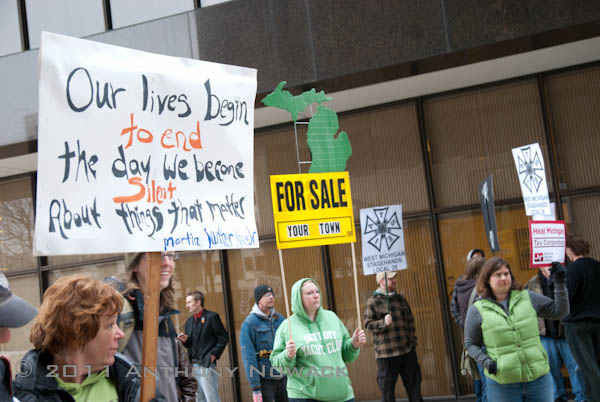 This morning while Michigan Governor Rick Snyder was sharing his “vision” for the state with an invitation only crowd inside City Hall in downtown Grand Rapids, about 75 people showed up to protest what many called anti-democratic policies.