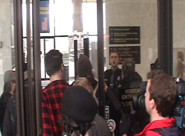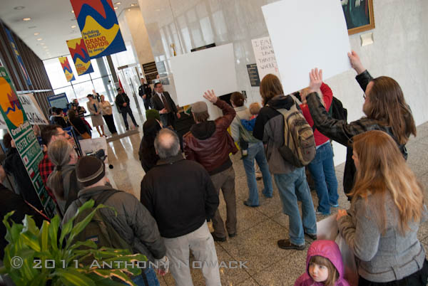 After standing just outside of City Hall for the first half hour, some people decided to go in despite police presence at the doors. Within 5 – 10 minutes roughly 40 people made their way into the City Hall lobby but were not allowed to go any further. Shortly after people entered the building those who had been invited to the closed meeting with Governor Snyder began exiting the elevators. There were City officials, County officials, State Rep. Roy Schmidt as well as numerous individuals from the private sector, such as Jeanne Englehart from the Grand Rapids Area Chamber of Commerce who passed through the crowd before leaving the building.