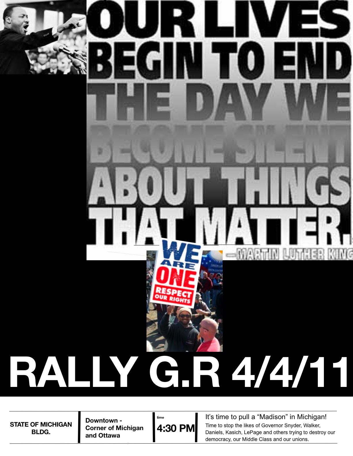 On April 4, 2011, join union members, community activists, people of faith, students, youth, LGBTQ, civil rights, and immigrant rights allies to stand in solidarity with working people in Wisconsin, Ohio, Indiana, Michigan and dozens of other states where well-funded, right-wing corporate politicians are trying to take away the rights Dr. King gave his life for: the freedom to bargain, to vote, to afford a college education and justice for all workers, immigrant and native-born. It’s a day to show movement with actions, teach-ins, worksite discussions, vigils, faith events – a day to be creative, but clear: We are one.”