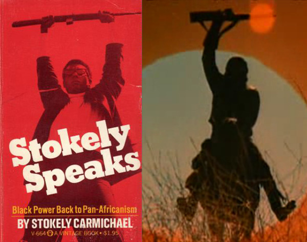 The comparison of imagery of the Stokely cover and the credits of TV series is a stretch. The rifle over head is common in many war movies and rallying cries. Such as this one by Charlton Heston http://is.gd/HtLi6U . Do you suppose he’s alluding to the ape in the opening sequence or the guy who wrote a book about Pan-Africanism?