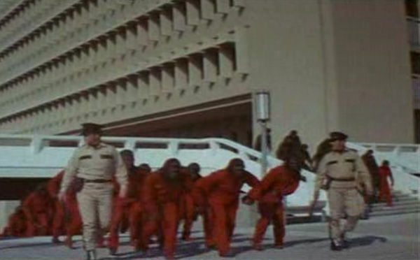 The original Planet of the Apes film was an astounding channeling of the sublimated (and sometimes not so sublimated) white fears of what would happen in a world run by Black people. Conquest of the Planet of the Apes was a reenactment of the race riots that swept across the U.S. throughout the 60s, and a strange brew of both celebration and denouncement of the prison riots that were taking over headlines, especially the Attica Rebellion of the previous year. I can only assume that by the time Conquest was filmed, the producers understood that a large part of the appeal of the franchise was its visceral articulation of white fear (of Black Power, miscegenation, emasculation), so they pushed it up a notch, creating a U.S. where primates truly are slaves—servants to humans with no free will. The opening credits of the film run on top of large groups of men dressed as gorillas and chimps walking while standing up, wearing red and green jumpsuits (respectively), and being corralled and threatened by armed, uniformed guards.