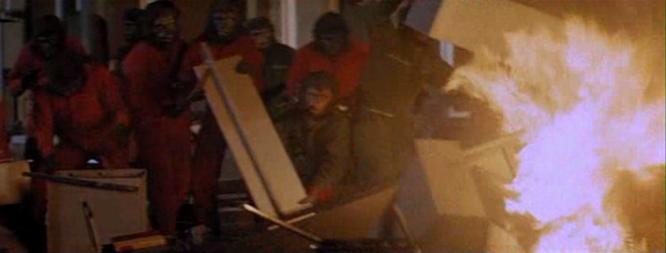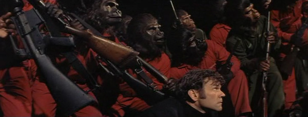 The larger revolt is certainly intended to evoke the urban riots of the ’60s in places like Detroit, Cleveland, and Watts. The apes are shown as intelligent and crafty, using advanced military planning to outwit the humans, as rioters often do (witness the past weeks’ revolt in the UK). If this wasn’t a clear enough indication for the audience that this film was about race (and full of references to the more political end of Blaxploitation films, like The Spook that Sat by the Door), the inclusion of a Black human character for whom the ape uprising causes both an identity crisis and an ethical dilemma—both terribly over-acted—throws the whole thing over the top.