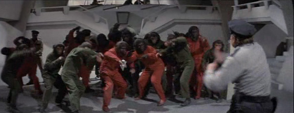 It is impossible to not read race, and the 1970s rise of the prison industry, into this. The rest of the film is an acting out of the apes coming to consciousness, rebellion, and eventual insurrection against their masters. Their revolt against the corporation that trains them to be good slaves is filmed just like a prison riot, and at one point a white guard actually bullwhips the black apes.