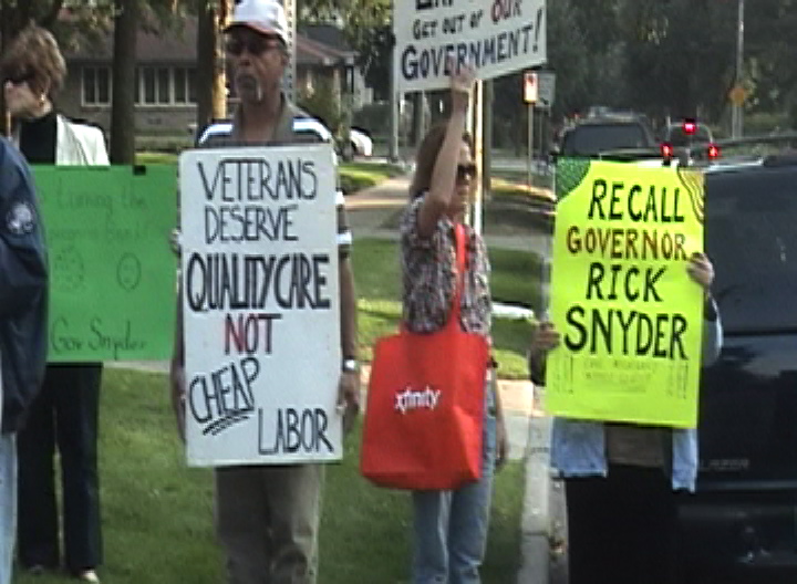 “Snyder wants to privatize and offer the jobs to the cheapest bidder, even if it means people are coming from Pizza Hut jobs,” said Skorupski. Other care-givers at the protest said that some of the privatization has already begun, which has meant that there are now more staff who have no prior experience working with people who have the needs that veterans do. Another woman said, “we have a long term relationship with our patients, which would end if the privatization proposal goes through.”