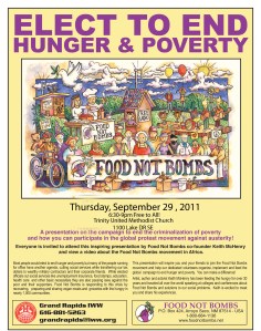 Most people would elect to end hunger and poverty but many of the people running for office have another agenda, cutting social services while transferring our tax dollars to wealthy military contractors and their corporate friends. While elected officials cut social services like unemployment insurance, food stamps, education, health care and other basic necessities they are also passing laws against the poor and their supporters.