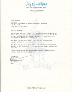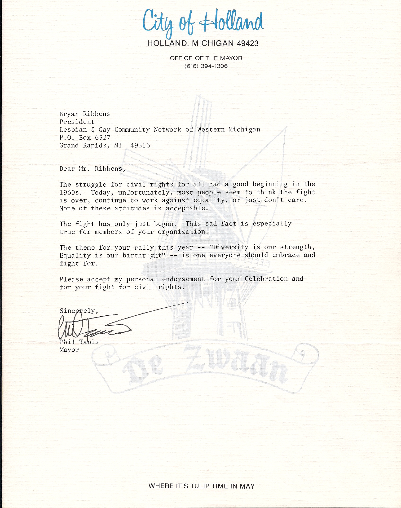 However, not all area mayors were opposed to what the Grand Rapids LBGT community was trying to accomplish at the time. In fact, in 1989, the Mayor of Holland, Phil Tanis, wrote a fairly compelling letter in support of Grand Rapids Pride.