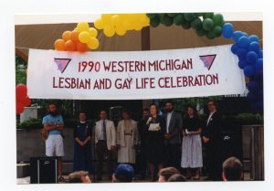 At the time, Mayor Gerald Helmholt, would not offer a city proclamation endorsing the Pride Celebration in the late 80s when the first events were held in Grand Rapids. Helmholt was also opposed to the first attempts to get an anti-discrimination ordinance passed in Grand Rapids in 1991 & 1992. Helmholt, a member of Citizens for a United Grand Rapids, was quoted in a June 3, 1992 Press article as saying, “I think it’s the basic belief of the group that a thorough investigation will reveal there is no more discrimination against gays and lesbians than there is against anyone else.”