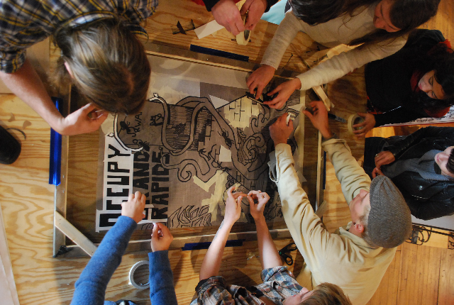 At one point I left the Occupy Grand Rapids gathering and went to the Red Hydrant Studio to be part of a workshop that the Beehive Collective was conducting on radical banner making.