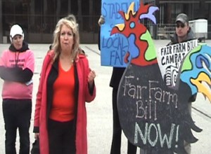 The speakers addressed the need to have more local control of the food we all consume, support for small family farms, which can’t compete with agribusiness, and the need to challenge the current Farm Bill provisions which favor large farming operations.