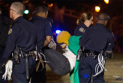 The Bay Area Occupy Movement received an unexpected shot in the arm last Wednesday when students protesting the creeping increase in fees in the UC system pitched a small number of tents on the grassy area in front of Sproul Hall. If Oakland Mayor Jean Quan drastically miscalculated when she unleashed the police in late October, the response by UCPD to this seemingly minor disturbance strays into the realm of the Epic Fail. Deploying overwhelming force, UCPD could be seen on video beating and spearing students with their batons, punching some in the face, and even dragging English Professor Celeste Langan down by her hair. Langan would later write about her experience, and another English Professor, Geoffrey O’Brien, was also injured by police on the day.