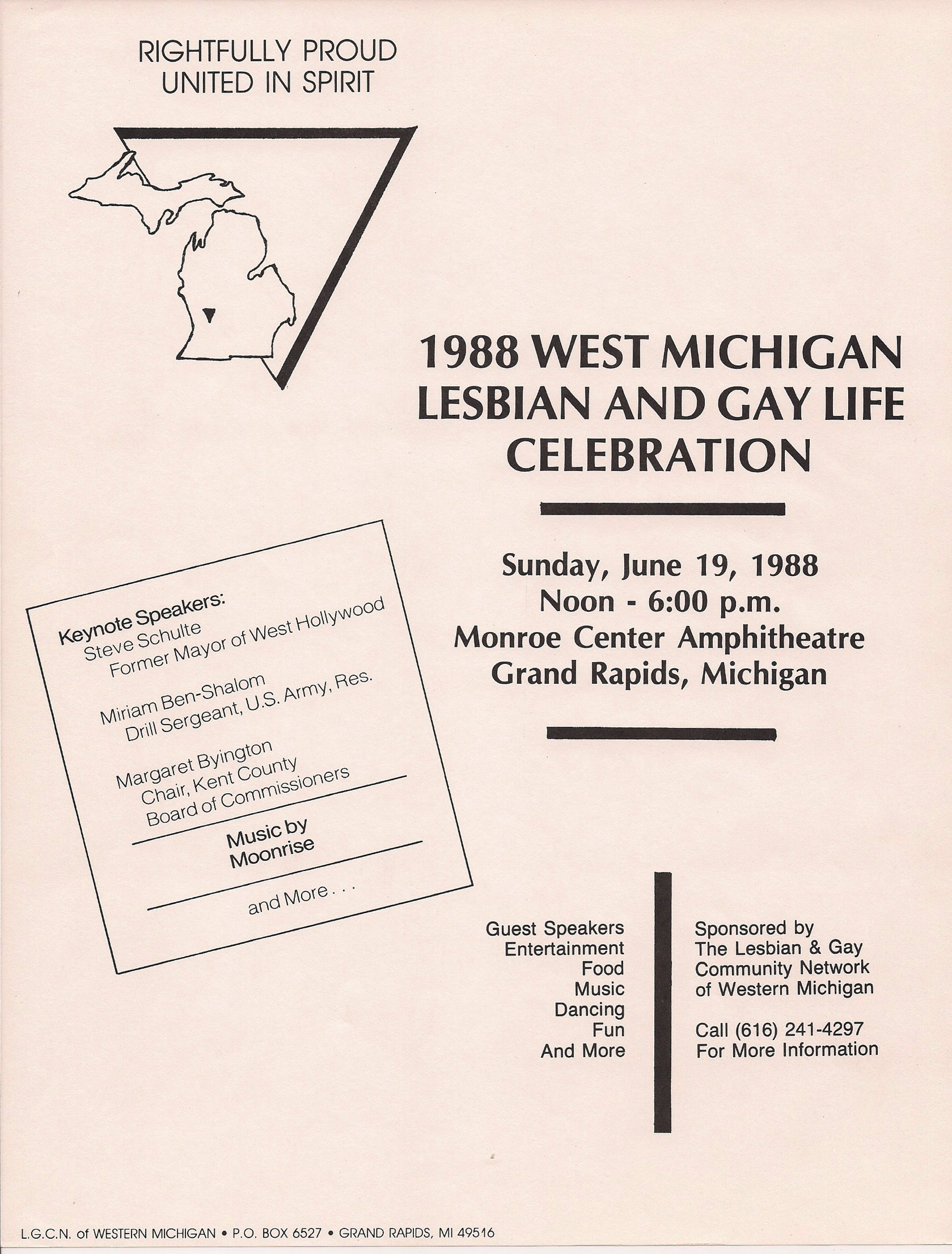 The Lesbian and Gay Community Network of Western Michigan, along with Dignity and Aradia organized the first ever Pride Celebration in Grand Rapids in June of 1988.