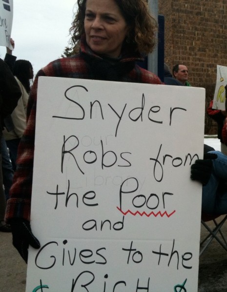 His signing of a law that forbid anyone who owned a car worth $15,000 to collect food stamps (after putting a two-year lifetime cap on welfare payments) had thrown thousands of already food-insufficient families into crisis. Many poor people have cars that they have nursed along for ten or twenty years, and in a state with minimal public transport, those cars are necessary if family members are going to look for work. But if they couldn’t even get food stamps, their choice was between any hope for employment or feeding their kids today or tomorrow. This law was so outrageous that Snyder was forced to partially back down on it as it received national attention.