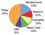 In 1980, 11 corporations received over half the revenue from book sales. By 2009, the number of corporations controlling half the $23.9 billion market had fallen to five: Bertelsmann (owner of RandomHouse), Pearson, Hachette, News Corp (Harper Collins) and CBS (Simon & Schuster). Of the five, four have significant holdings in other media industries. Pearson, while not vertically integrated, takes solace in being the largest education company in the world.