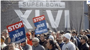 If Daniels signs the bill before the big game, demonstrations sponsored by the AFL-CIO in partnership with the Occupy Movement will greet the 100,000 people who can afford the pilgrimage to Lucas Oil Field. The NFLPA, I’ve been told by sources, will also not be silent in the days to come. As Occupy protester Tithi Bhattacharya said to me, “If the bill becomes law this week then it is very important for all of us to protest this Sunday. We should show the 1% that the fate of Indiana cannot be decided with the swish of a pen by corporate politicians – the Super Bowl should be turned into a campaign for justice and jobs.”
