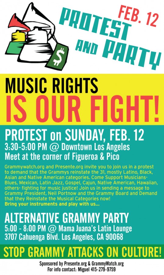 You can find more information, and sign the petition to restore the stricken categories at www.grammywatch.org. That’s www.grammywatch.org. The decisions of what music to study and play and listen and dance to are decisions that audiences and artists should make. They are much too important to be reserved for greedy and racist recording industry executives. Letting them make that decision for us IS cultural genocide.