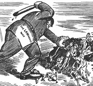 Once it became known that children were being sent away to live with other family members word got out across the country that the striking workers needed more solidarity. The famous reproductive rights champion, Margaret Sanger, even came to Lawrence to help with organizing the children who were put on trains. Children were leaving in groups of one hundred or more. This tactic of sending children away caught the attention of the factory owners and the local police who then began to harass the women and children who were going to the train station. It was in this context that led to the February 24, 1912 police repression, where parents and children arriving at the station were beaten with clubs, arrested and charges with “congregating.”