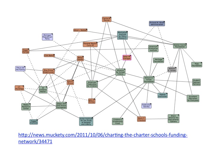 The Acton Institute supports economic policy that promotes deregulation of the economy and austerity measures (similar to what Michigan is experiencing under Gov. Snyder). It is no surprise then that the DeVos family has been a big supporter of the Acton Institute, with Betsy DeVos previously serving on the Board of Directors and the DeVos family being major donors to the think tank. Richard DeVos Sr. was also given the Faith and Freedom Award from the Acton Institute in 2010. You can see from the graphic below the interlocking systems of power that connect the DeVos family and the Acton Institute.