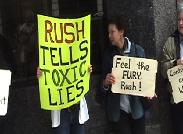 The group held signs just outside the entrance to the Clear Channel/WOOD Radio offices at 77 Monroe Center and some of those involved with the protest handed out Dump Rush Campaign material to people passing by.