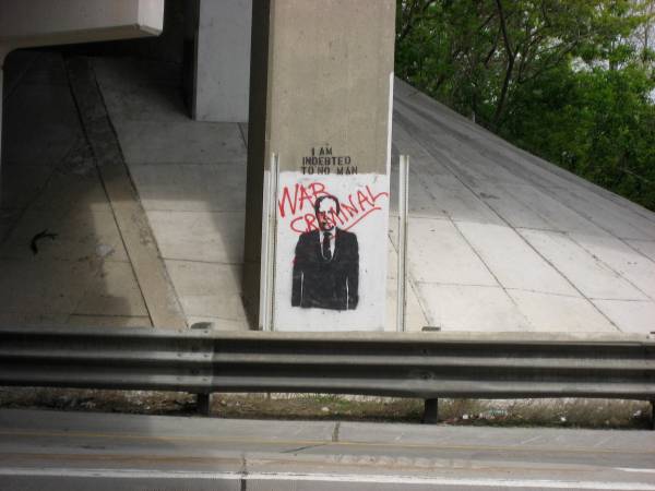 As you can see from the pictures, there are at least two of the images of Ford, which now include the words “War Criminal.”