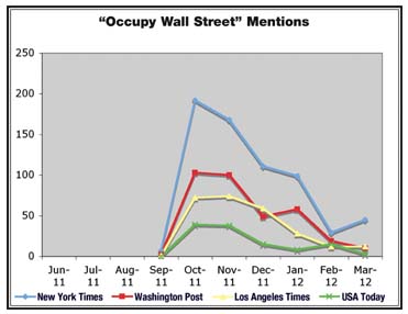 The spike and subsequent drop-off for “corporate greed” was even more pronounced. After only five total mentions in the four leading papers from June through September, the numbers skyrocketed to 62 mentions in October—again, at the peak of Occupy coverage. The following month, however, “corporate greed” only showed up 19 times. By January, it had completely disappeared from the pages of USA Today and the L.A. Times and made only a meager showing at the New York Times (four mentions) and Washington Post (one).