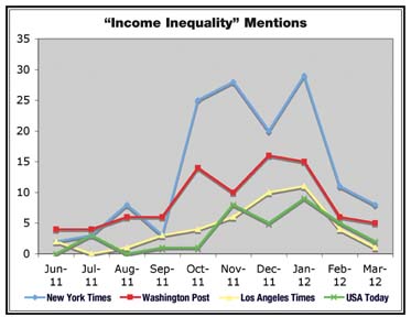 By March, there were only 16 mentions of “income inequality,” half from the New York Times—which also far outpaced the other papers in coverage of OWS that month, at 45 mentions to the L.A. Times’ 12, the Post’s 10 and USA Today’s three, due in part to the scores arrested in New York City on the movement’s six-month anniversary on March 17.