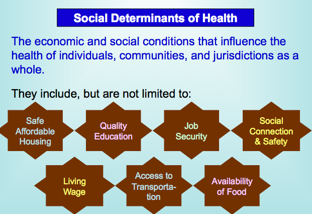 The co-facilitators then looked at the various determinants of health inequality in the US and said that things like housing, transportation, education, job security, access to health foods and a living wage were some of the determinants.