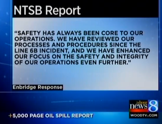 In addition, the MLive story also includes a response from Enbridge, as did most of the other major media sources in West Michigan. The WOOD TV 8 story quoted an Enbridge executive who stated, “Safety has always been core to our operations. We have reviewed our processes and procedures since the Line 6B incident, and we have enhanced our focus on the safety and integrity of our operations even further.”